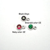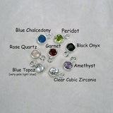 - Blue chalcedony, black onyx, and rose quartz charms are also available.